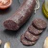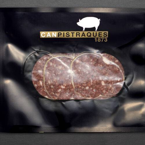 Bull negro en cortes, hecho de papada sin corteza y diferentes partes del cerdo, embutida en tripa de cerdo natural y hervido en caldo natural a fuego lento. Destaca por los trozos de lengua que puedes encontrar en su interior y que le dan un toque distintivo.